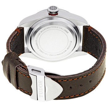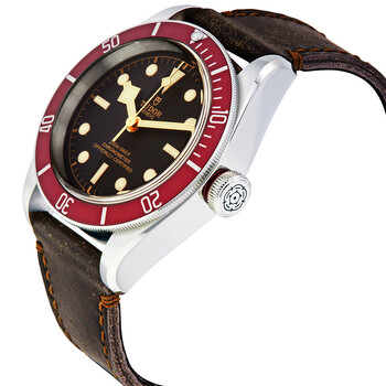 Stainless steel case with a dark brown (aged) leather strap. Uni-directional rotating stainless steel bezel with a red aluminium ring. Black dial with luminous gold-tone hands and dot hour markers. Minute markers around the outer rim. Dial Type: Analog. Luminescent hands and markers. Tudor calibre MT5602 automatic movement with a 70-hour power reserve. Scratch resistant sapphire crystal. Screw down crown. Solid case back. Round case shape. Case size: 41 mm. Band width: 22 mm. Fold over clasp. Water resistant at 200 meters / 660 feet. Functions: hour, minute, second, chronometer. Luxury watch style. Watch label: Swiss Made. Tudor Heritage Black Bay Black Dial Automatic Men's Aged Leather Watch M79230R-0011.