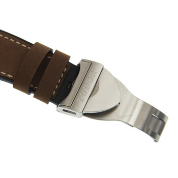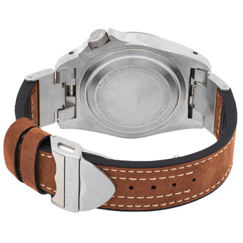 Silver-tone stainless steel case with a brown hybrid leather and rubber strap. Bi-directional rotating silver-tone stainless steel bezel. Black dial with luminous silver-tone snowflake-shape hands and dot hour markers. Minute markers around the outer rim. Dial Type: Analog. Luminescent hands and markers. Date display at the 3 o'clock position. Tudor Calibre MT5612 Automatic movement, containing 26 Jewels, bitting at 28800 vph, and has a power reserve of approximately 70 hours. Scratch resistant sapphire crystal. Screw down crown. Solid case back. Round case shape, case size: 42 mm. Band width: 22 mm. Deployment clasp. Water resistant at 200 meters / 660 feet. Functions: date, hour, minute, second, chronometer. Additional Info: original box, manual (complete accessories). Heritage Black Bay Series. Sport watch style. Watch label: Swiss Made. Tudor Heritage Black Bay Black Dial Men's Watch M70150-0001.
