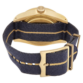 Bronze case with a blue fabric strap. Uni-directional rotating bronze bezel with a anodised blue aluminium ring. Blue dial with luminous gold-tone snowflake hands and dot hour markers. Arabic numerals mark the 3, 6, and 9 o'clock positions. minute markers around the outer rim. Dial Type: Analog. Luminescent hands and markers. Tudor calibre MT5601 automatic movement, based upon Tudor MT5612, containing 26 Jewels, bitting at 28800 vph, and has a power reserve of approximately 70 hours. Scratch resistant sapphire crystal. Screw down crown. Solid case back. Round case shape. Case size: 43 mm. Tang clasp. Water resistant at 200 meters / 660 feet. Functions: hour, minute, second, chronometer. Casual watch style. Watch label: Swiss Made. Tudor Heritage Black Bay Bronze Blue Special Edition for Bucherer M79250BB-0001.