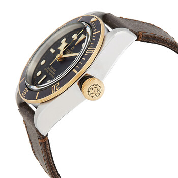 Silver-tone stainless steel case with a dark brown leather strap. Uni-directional rotating yellow gold with a black aluminium ring bezel. Black dial with luminous yellow gold-tone snowflake-shape hands and dot hour markers. Minute markers around the outer rim. Dial Type: Analog. Luminescent hands and markers. Date display at the 3 o'clock position. Tudor Calibre MT5612 automatic movement with a 70-hour power reserve. Scratch resistant sapphire crystal. Screw down crown. Solid case back. Round case shape. Case size: 41 mm. Fold over clasp. Water resistant at 200 meters / 660 feet. Functions: date, hour, minute, second, chronometer. Dive watch style. Watch label: Swiss Made. Tudor Heritage Black Bay S G Automatic 41 mm Men's Watch M79733N-0007.