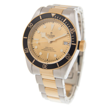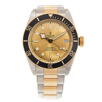 Stainless steel case with a stainless steel bracelet with 18kt yellow gold center links. Uni-directional rotating coin edge 18kt yellow gold bezel with a black (count-up elapsed time) top ring. Gold dial with luminous black snowflake-shaped hands and dot hour markers. Minute markers around the outer rim. Dial Type: Analog. Luminescent hands and markers. Date display at the 3 o'clock position. Tudor calibre MT5612 automatic movement, containing 26 Jewels, bitting at 28800 vph, and has a power reserve of approximately 70 hours. Scratch resistant sapphire crystal. Screw down crown. Solid case back. Round case shape. Case size: 41 mm. Band width: 22 mm. Fold over clasp with a safety release. Water resistant at 200 meters / 660 feet. Functions: date, hour, minute, second, chronometer. Additional Info: original box, international warranty card, manual (complete accessories). Heritage Ranger Series. Luxury watch style. Watch label: Swiss Made. Tudor Heritage Ranger Automatic Chronometer Watch 79733NCH.
