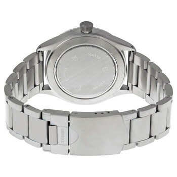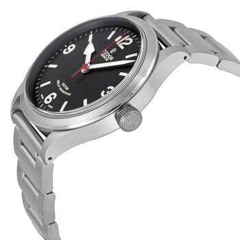 Stainless steel case with a stainless steel bracelet. Fixed stainless steel bezel. Black dial with luminous silver-tone arrow-shaped hands and index hour markers. Arabic numerals mark the 3, 6, 9 and 12 o'clock positions. Minute markers around the outer rim. Dial Type: Analog. Luminescent hands and markers. ETA caliber 2824 automatic movement, containing 25 Jewels, bitting at 28800 vph, and has a power reserve of approximately 38 hours. Scratch resistant sapphire crystal. Screw down crown. Solid case back. Round case shape. Case size: 41 mm. Band width: 20 mm. Fold over clasp with a push button release. Water resistant at 150 meters / 500 feet. Functions: hour, minute, second. Dress watch style. Watch label: Swiss Made. Tudor Heritage Ranger Black Dial Automatic 41 mm Men's Watch M79910-0011.