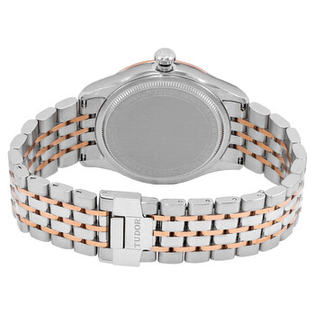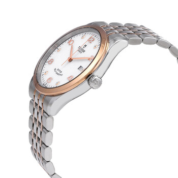 Stainless steel case with a stainless steel bracelet with rose gold links. Fixed rose gold bezel. White dial with rose gold-tone hands and alternating Arabic numeral and diamond hour markers. Minute markers around the outer rim. Dial Type: Analog. Date display at the 3 o'clock position. Tudor calibre T601 automatic movement, based upon ETA 2824, containing 25 Jewels, bitting at 28800 vph, and has a power reserve of approximately 38 hours. Scratch resistant sapphire crystal. Screw down crown. Round case shape. Case size: 39 mm. Fold over clasp with a safety release. Water resistant at 100 meters / 330 feet. Functions: date, hour, minute, second. M91551-0011 Series. Luxury watch style. Watch label: Swiss Made. Tudor M91551-0011 Automatic Diamond White Dial Ladies Watch M91551-0011.