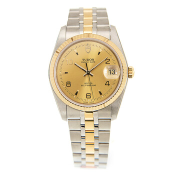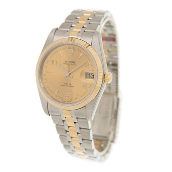 Stainless steel case with a stainless steel bracelet with 18kt yellow gold center links. Fixed stainless steel bezel with a 18kt yellow gold ring. Gold dial with luminous yellow gold-tone hands and alternating Arabic numeral & index hour markers. Minute markers around the outer rim. Dial Type: Analog. Luminescent hands and markers. Date display at the 3 o'clock position. Automatic movement. Scratch resistant sapphire crystal. Solid case back. Round case shape. Case size: 34 mm. Case thickness: 10.7 mm. Fold over clasp. Water resistant at 50 meters / 165 feet. Functions: date, hour, minute, second. Additional Info: original box, manual (complete accessories). Luxury watch style. Watch label: Swiss Made. Tudor Price Date-Day Automatic Watch 74033-62473-246810AR-CH.