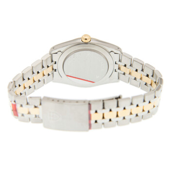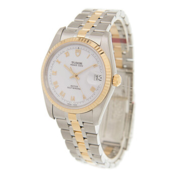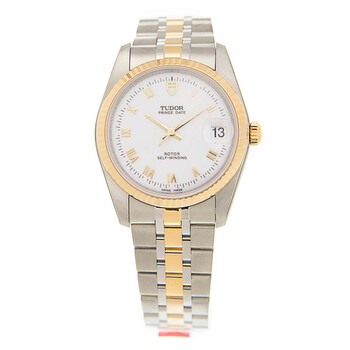 Stainless steel case with a stainless steel bracelet with 18kt yellow gold links. Fluted fixed 18kt yellow gold bezel. White dial with gold-tone hands and Roman numeral hour markers. Minute markers around the outer rim. Dial Type: Analog. Luminescent hands and markers. Date display at the 3 o'clock position. Automatic movement. Scratch resistant sapphire crystal. Screw down crown. Solid case back. Round case shape. Case size: 34 mm. Fold over clasp. Water resistant at 100 meters / 330 feet. Functions: date, hour, minute, second. Additional Info: original box, international warranty card, manual (complete accessories). Price Date-day Series. Luxury watch style. Watch label: Swiss Made. Tudor Price Date-Day Automatic White Dial Watch 74033-62473-WTRN.