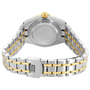 Silver-tone stainless steel case with a silver-tone stainless steel with 18k yellow gold links bracelet. Fixed 18k yellow gold bezel. Black dial with luminous yellow gold-tone hands and Roman numeral hour markers. Minute markers around the outer rim. Dial Type: Analog. Luminescent hands. Date display at the 3 o'clock position. Tudor Calibre T201 Automatic movement, based upon ETA 2671, containing 25 Jewels, bitting at 28800 vph, and has a power reserve of approximately 38 hours. Scratch resistant sapphire crystal. Screw down crown. Solid case back. Round case shape, case size: 28 mm. Fold over clasp. Water resistant at 100 meters / 330 feet. Functions: date, hour, minute, second. Royal Series. Luxury watch style. Watch label: Swiss Made. Tudor Royal Automatic Black Dial 28 mm Ladies Watch M28303-0003.
