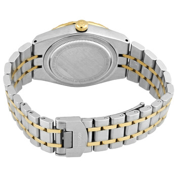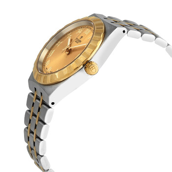 Silver-tone stainless steel case with a silver-tone stainless steel with 18kt yellow gold links bracelet. Fixed 18kt yellow gold bezel. Champagne dial with luminous yellow gold hands and Roman numeral hour markers. Minute markers around the outer rim. Dial Type: Analog. Luminescent hands. Date display at the 3 o'clock position. Tudor Calibre T601 Automatic movement, based upon ETA 2824, containing 25 Jewels, bitting at 28800 vph, and has a power reserve of approximately 38 hours. Scratch resistant sapphire crystal. Screw down crown. Solid case back. Round case shape, case size: 34 mm. Fold over clasp. Water resistant at 100 meters / 330 feet. Functions: date, hour, minute, second. Royal Series. Luxury watch style. Watch label: Swiss Made. Tudor Royal Automatic Champagne Dial 34 mm Watch M28403-0004.