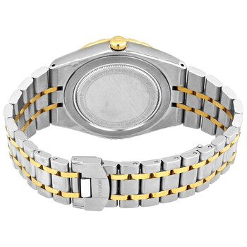 Silver-tone stainless steel case with a silver-tone stainless steel with 18kt yellow gold links bracelet. Fixed 18kt yellow gold bezel. Champagne dial with luminous yellow gold-tone hands and Roman numeral hour markers. Minute markers around the outer rim. Dial Type: Analog. Luminescent hands. Date display at the 3 o'clock position. day of the week display centered on the 12 o'clock position. Tudor Calibre T603 Automatic movement, containing 25 Jewels, bitting at 28800 vph, and has a power reserve of approximately 38 hours. Scratch resistant sapphire crystal. Screw down crown. Solid case back. Round case shape, case size: 41 mm. Fold over clasp. Water resistant at 100 meters / 330 feet. Functions: day, date, hour, minute, second. Royal Series. Luxury watch style. Watch label: Swiss Made. Tudor Royal Automatic Champagne Dial 41 mm Watch M28603-0004.