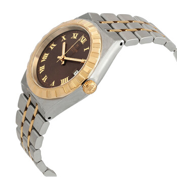 Silver-tone stainless steel case with a silver-tone stainless steel bracelet with 18kt yellow gold links. Fixed 18kt yellow gold bezel. Chocolate brown dial with gold-tone hands and Roman numeral hour markers. Minute markers around the outer rim. Dial Type: Analog. Date display at the 3 o'clock position. Tudor Calibre T601 Automatic movement, based upon ETA 2824, containing 25 Jewels, bitting at 28800 vph, and has a power reserve of approximately 38 hours. Scratch resistant sapphire crystal. Screw down crown. Solid case back. Round case shape, case size: 34 mm. Fold over clasp with a safety release. Water resistant at 50 meters / 165 feet. Functions: date, hour, minute, second. Royal Series. Luxury watch style. Watch label: Swiss Made. Tudor Royal Automatic Chocolate Brown Dial Two-Tone Ladies Watch M28403-0008.