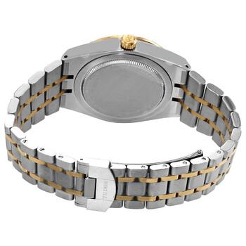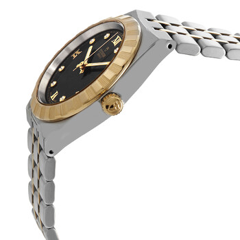 Stainless steel case with a 316L steel bracelet with 18kt yellow gold links. Fixed fluted 18kt yellow gold bezel. Black dial with luminous yellow gold-tone hands and diamond hour markers. Roman numerals apperar at the 6, 9 and 12 o'clock positions. Minute markers around the outer rim. Dial Type: Analog. Luminescent hands. Date display at the 3 o'clock position. Tudor calibre T601 automatic movement with a 38-hour power reserve. Scratch resistant sapphire crystal. Screw down crown. Solid case back. Round case shape. Case size: 34 mm. Fold over clasp. Water resistant at 100 meters / 330 feet. Functions: date, hour, minute, second. Royal Series. Dress watch style. Watch label: Swiss Made. Tudor Royal Automatic Diamond Black Dial 34 mm Watch M28403-0005.