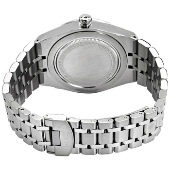Silver-tone 316L stainless steel case and bracelet. Fixed silver-tone 316L stainless steel bezel. Black dial with luminous silver-tone hands and diamond hour markers. Roman numerals appear at the 3, 6 and 9 o'clock positions. Minute markers around the outer rim. Dial Type: Analog. Luminescent hands. Date display at the 3 o'clock position. day of the week display centered on the 12 o'clock position. Tudor Calibre T603 Automatic movement, containing 25 Jewels, bitting at 28800 vph, and has a power reserve of approximately 38 hours. Scratch resistant sapphire crystal. Screw down crown. Solid case back. Round case shape, case size: 41 mm. Fold over clasp. Water resistant at 100 meters / 330 feet. Functions: date, day, hour, minute, second. Royal Series. Luxury watch style. Watch label: Swiss Made. Tudor Royal Automatic Diamond Black Dial 41 mm Watch M28600-0004.