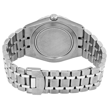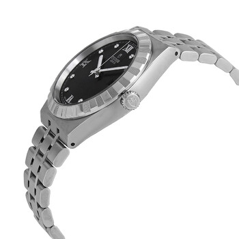 316L steel case with a 316L steel bracelet. Fixed 316L steel bezel. Black dial with luminous silver-tone hands and diamond hour markers. Roman numerals appear at the 3, 6, 9 and 12 o'clock positions. Minute markers around the outer rim. Dial Type: Analog. Luminescent hands. Date display at the 3 o'clock position. Tudor calibre T601 automatic movement with a 38-hour power reserve. Scratch resistant sapphire crystal. Screw down crown. Solid case back. Round case shape. Case size: 38 mm. Fold over clasp. Water resistant at 100 meters / 330 feet. Functions: date, hour, minute, second. Royal Series. Dress watch style. Watch label: Swiss Made. Tudor Royal Automatic Diamond Black Dial Watch M28500-0004.