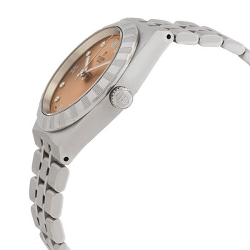 Silver-tone stainless steel case and bracelet. Fixed silver-tone stainless steel bezel. Salmon dial with silver-tone hands and diamond hour markers. Roman numeral marks the 3, 6, 9 and 12 o'clock positions. Minute markers around the outer rim. Dial Type: Analog. Luminescent hands. Date display at the 3 o'clock position. Tudor Calibre T601 Automatic movement, based upon ETA 2824, containing 25 Jewels, bitting at 28800 vph, and has a power reserve of approximately 38 hours. Scratch resistant sapphire crystal. Screw down crown. Solid case back. Round case shape, case size: 34 mm. Fold over clasp with a safety release. Water resistant at 100 meters / 330 feet. Functions: date, hour, minute, second. Royal Series. Luxury watch style. Watch label: Swiss Made. Tudor Royal Automatic Diamond Salmon Dial Ladies Watch M28400-0011.
