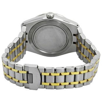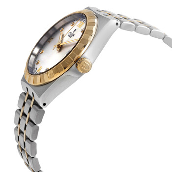 Silver-tone stainless steel case with a silver-tone stainless steel with 18kt yellow gold links bracelet. Fixed 18kt yellow gold bezel. Silver dial with luminous yellow gold hands and diamond hour markers. Roman numerals appear at the 3, 6, 9 and 12 o'clock positions. Minute markers around the outer rim. Dial Type: Analog. Date display at the 3 o'clock position. ETA Caliber 2824 Automatic movement, containing 25 Jewels, bitting at 28800 vph, and has a power reserve of approximately 38 hours. Scratch resistant sapphire crystal. Screw down crown. Solid case back. Round case shape, case size: 38 mm. Fold over clasp. Water resistant at 100 meters / 330 feet. Functions: date, hour, minute, second. Royal Series. Luxury watch style. Watch label: Swiss Made. Tudor Royal Automatic Diamond Silver Dial 38 mm Watch M28503-0002.