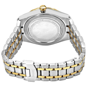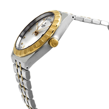 Stainless steel case with a stainless steel bracelet with18kt yellow gold links. Fixed 18kt yellow gold bezel. Silver dial with luminoius yellow gold hands and diamond hour markers. Roman numerals appear at the 3, 6, and 9 o'clock positions. Minute markers around the outer rim. Dial Type: Analog. Luminescent hands. Date display at the 3 o'clock position. Day of the week display centered on the 12 o'clock position. Calibre 2834 automatic movement. Scratch resistant sapphire crystal. Screw down crown. Solid case back. Round case shape. Case size: 41 mm. Folding clasp. Water resistant at 100 meters / 330 feet. Functions: date, day, hour, minute, second. Royal Series. Luxury watch style. Watch label: Swiss Made. Tudor Royal Automatic Diamond Silver Dial 41 mm Watch M28603-0002.