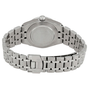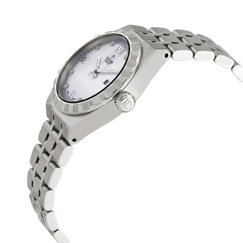 316L steel case with a 316L steel bracelet. Fixed 316L steel bezel. Mother of pearl dial with luminous silver-tone hands and diamond hour markers. Roman numerals appear at the 3, 6, 9 and 12 o'clock positions. Minute markers around the outer rim. Dial Type: Analog. Luminescent hands. Date display at the 3 o'clock position. Tudor calibre T201 automatic movement, based upon ETA 2671, containing 25 Jewels, bitting at 28800 vph, and has a power reserve of approximately 38 hours. Scratch resistant sapphire crystal. Screw down crown. Solid case back. Round case shape. Case size: 28 mm. Fold over clasp. Water resistant at 100 meters / 330 feet. Functions: date, hour, minute, second. Royal Series. Dress watch style. Watch label: Swiss Made. Tudor Royal Automatic Diamond Watch M28300-0005.