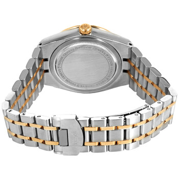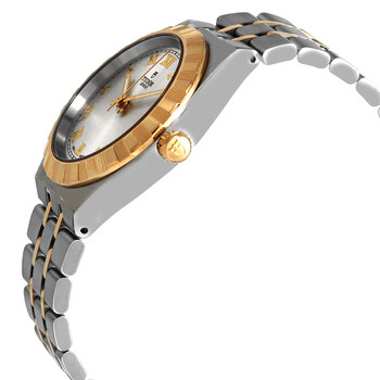 Silver-tone stainless steel case with a silver-tone stainless steel with 18kt yellow gold links bracelet. Fixed 18kt yellow gold bezel. Silver dial with luminous yellow gold hands and Roman numeral hour markers. Minute markers around the outer rim. Dial Type: Analog. Luminescent hands. Date display at the 3 o'clock position. Tudor Calibre T601 Automatic movement, based upon ETA 2824, containing 25 Jewels, bitting at 28800 vph, and has a power reserve of approximately 38 hours. Scratch resistant sapphire crystal. Screw down crown. Solid case back. Round case shape, case size: 34 mm. Fold over clasp. Water resistant at 100 meters / 330 feet. Functions: date, hour, minute, second. Royal Series. Luxury watch style. Watch label: Swiss Made. Tudor Royal Automatic Silver Dial 34 mm Watch M28403-0001.