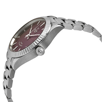 Stainless steel case with a stainless steel bracelet. Fixed fluted stainless steel bezel. Burgundy dial with silver-tone hands and index hour markers. Minute markers around the outer rim. Dial Type: Analog. Date display at the 3 o'clock position. Tudor calibre 2824 automatic movement, based upon ETA 2824, containing 25 Jewels, bitting at 28800 vph, and has a power reserve of approximately 38 hours. Scratch resistant sapphire crystal. Screw down crown. Solid case back. Round case shape. Case size: 34 mm. Band width: 16 mm. Folding clasp. Water resistant at 100 meters / 330 feet. Functions: date, hour, minute, second. Luxury watch style. Watch label: Swiss Made. Tudor Style 34 Automatic Burgundy Dial Unisex Watch 12310-0015.