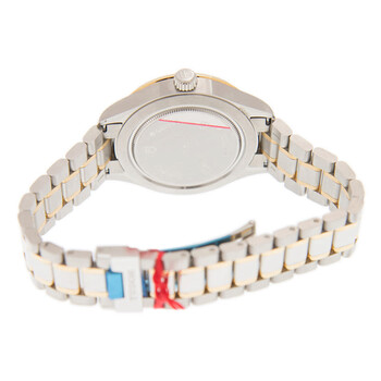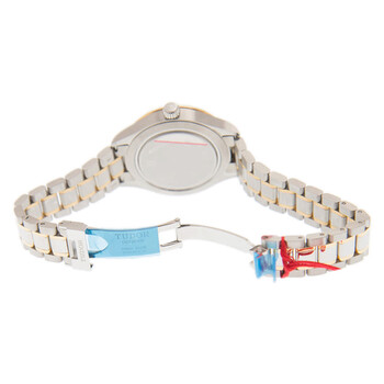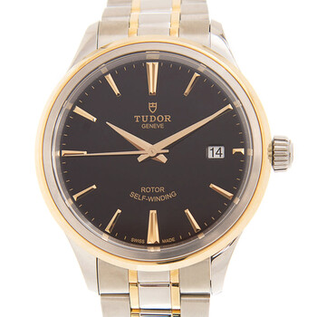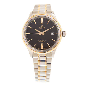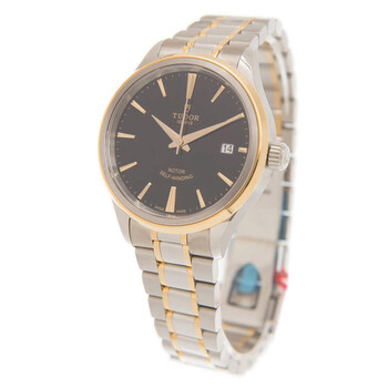 Stainless steel case with a stainless steel bracelet with 18kt yellow gold links. Fixed stainless steel and 18kt yellow gold bezel. Black dial with yellow gold-tone dauphine-style hands and index hour markers. Minute markers around the outer rim. Dial Type: Analog. Date display at the 3 o'clock position. Tudor calibre 2824 automatic movement, based upon ETA 2824, containing 25 Jewels, bitting at 28800 vph, and has a power reserve of approximately 38 hours. Scratch resistant mineral crystal. Screw down crown. Solid case back. Round case shape. Case size: 38 mm. Fold over clasp. Water resistant at 100 meters / 330 feet. Functions: date, hour, minute, second. Style Series. Dress watch style. Watch label: Swiss Made. Tudor Style Automatic Black Dial Men's Watch 12503-0003.