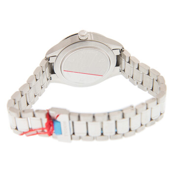 Silver-tone stainless steel case with a silver-tone stainless steel bracelet. Fixed silver-tone stainless steel bezel. Blue dial with silver-tone hands and index hour markers. Minute markers around the outer rim. Dial Type: Analog. Day of the week and date display at the 3 o'clock position. Tudor Calibre 2824 Automatic movement, based upon ETA 2824, containing 25 Jewels, bitting at 28800 vph, and has a power reserve of approximately 38 hours. Scratch resistant sapphire crystal. Screw down crown. Solid case back. Round case shape, case size: 34 mm. Fold over clasp. Water resistant at 100 meters / 330 feet. Functions: date, hour, minute, second. Style Series. Luxury watch style. Watch label: Swiss Made. Tudor Style Automatic Blue Dial Ladies Watch 12310-0013.