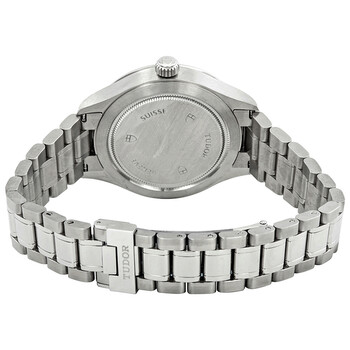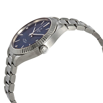 Stainless steel case with a stainless steel bracelet. Fixed fluted stainless steel bezel. Blue dial with silver-tone hands and index hour markers. Diamonds set at the 3, 6 and 9 o'clock positions. Minute markers around the outer rim. Dial Type: Analog. Date display at the 3 o'clock position. Tudor calibre 2824 automatic movement, based upon ETA 2824, containing 25 Jewels, bitting at 28800 vph, and has a power reserve of approximately 38 hours. Scratch resistant sapphire crystal. Screw down crown. Solid case back. Round case shape. Case size: 38 mm. Band width: 19 mm. Fold over clasp with a safety release. Water resistant at 100 meters / 330 feet. Functions: date, hour, minute, second. Style Series. Casual watch style. Watch label: Swiss Made. Tudor Style Automatic Blue Diamond Dial 38 mm Watch M12510-0017.