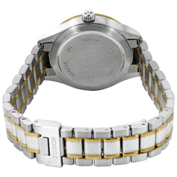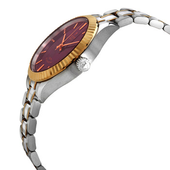 Stainless steel case with a stainless steel bracelet with yellow gold links. Fixed fluted yellow gold bezel. Burgundy dial with yellow gold-tone hands and index hour markers. Minute markers around the outer rim. Dial Type: Analog. Date display at the 3 o'clock position. Tudor calibre 2824 automatic movement, based upon ETA 2824, containing 25 Jewels, bitting at 28800 vph, and has a power reserve of approximately 38 hours. Scratch resistant sapphire crystal. Screw down crown. Solid case back. Round case shape. Case size: 34 mm. Fold over clasp. Water resistant at 100 meters / 330 feet. Functions: date, hour, minute, second. Style Series. Luxury watch style. Watch label: Swiss Made. Tudor Style Automatic Burgundy Dial Ladies 34 mm Watch M12313-0013.
