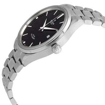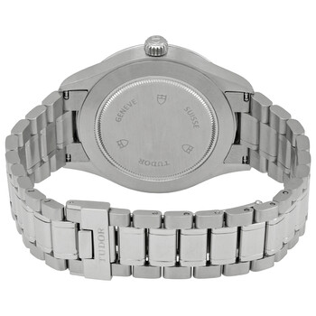 Stainless steel case with a stainless steel bracelet. Fixed stainless steel bezel. Black dial with silver-tone hands and index hour markers. Diamonds mark the 3, 6 and 9 o'clock positions. Minute markers around the outer rim. Dial Type: Analog. Date display at the 3 o'clock position. Tudor calibre 2824 automatic movement, based upon ETA 2824, containing 25 Jewels, bitting at 28800 vph, and has a power reserve of approximately 38 hours. Scratch resistant sapphire crystal. Screw down crown. Solid case back. Round case shape. Case size: 41 mm. Band width: 22 mm. Fold over clasp. Water resistant at 100 meters / 330 feet. Functions: date, hour, minute, second. Luxury watch style. Watch label: Swiss Made. Tudor Style Automatic Diamond Black Dial 41 mm Men's Watch M12700-0004.