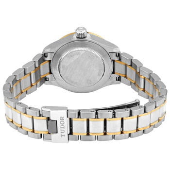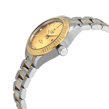 Stainless steel case with a stainless steel bracelet with yellow gold accents. Fixed yellow gold bezel. Champagne dial with yellow gold-tone hands and index hour markers. Diamonds set at the 3, 6 and 9 o'clock positions. Minute markers around the outer rim. Dial Type: Analog. Date display at the 3 o'clock position. Tudor calibre 2671 automatic movement, based upon ETA 2671, containing 25 Jewels, bitting at 28800 vph, and has a power reserve of approximately 38 hours. Scratch resistant sapphire crystal. Screw down crown. Solid case back. Round case shape. Case size: 28 mm. Fold over clasp. Water resistant at 100 meters / 330 feet. Functions: date, hour, minute, second. Style Series. Luxury watch style. Watch label: Swiss Made. Tudor Style Automatic Diamond Champagne Dial Ladies 28 mm Watch M12113-0007.