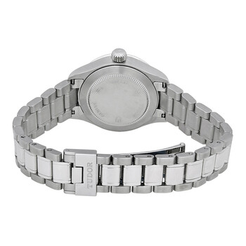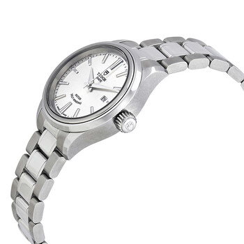 Stainless steel case with a stainless steel bracelet. Fixed stainless steel bezel. Silver dial with silver-tone hands and index hour markers. Minute markers around the outer rim. Dial Type: Analog. Date display at the 3 o'clock position. Tudor calibre 2671 automatic movement with a 38-hour power reserve. Scratch resistant sapphire crystal. Screw down crown. Solid case back. Round case shape. Case size: 28 mm. Fold over clasp. Water resistant at 100 meters / 330 feet. Functions: date, hour, minute, second. Luxury watch style. Watch label: Swiss Made. Tudor Style Automatic Silver Dial Ladies Watch 12100-0001.