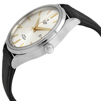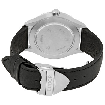 Stainless steel case with a black leather strap. Fixed stainless steel bezel. Silver dial with gold-tone dauphine hands and index hour markers. Minute markers around the outer rim. Dial Type: Analog. Date display at the 3 o'clock position. Tudor calibre 2824 automatic movement, based upon ETA 2824, containing 25 Jewels, bitting at 28800 vph, and has a power reserve of approximately 38 hours. Scratch resistant sapphire crystal. Screw down crown. Solid case back. Round case shape. Case size: 41 mm. Band width: 20 mm. Fold over clasp. Water resistant at 100 meters / 330 feet. Functions: chronograph, hour, minute, second. Luxury watch style. Watch label: Swiss Made. Tudor Style Automatic Silver Dial Unisex Watch M12700-0018.