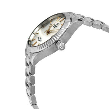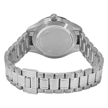 Stainless steel case with a stainless steel bracelet. Fixed fluted stainless steel bezel. Silver dial with gold-tone hands and index hour markers. Minute markers around the outer rim. Dial Type: Analog. Date display at the 3 o'clock position. Tudor calibre 2824 automatic movement with a 38-hour power reserve. Scratch resistant sapphire crystal. Screw down crown. Solid case back. Round case shape. Case size: 34 mm. Case thickness: 10 mm. Bracelet width: 16 mm. Fold over clasp. Water resistant at 100 meters / 330 feet. Functions: date, hour, minute, second. Luxury watch style. Watch label: Swiss Made. Tudor Style Automatic Silver Dial Men's Watch M12310-0005.