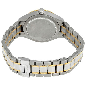 Silver-tone stainless steel case with a two-tone (silver-tone and gold-tone) stainless steel with yellow gold bracelet. Fixed two-tone (silver-tone and gold-tone) yellow gold and stainless steel bezel. Silver-tone dial with yellow gold-tone dauphine-style shape hands and index hour markers. Minute markers around the outer rim. Dial Type: Analog. Date display at the 3 o'clock position. Tudor Calibre 2824 Automatic movement, based upon ETA 2824, containing 25 Jewels, bitting at 28800 vph, and has a power reserve of approximately 38 hours. Scratch resistant sapphire crystal. Screw down crown. Solid case back. Round case shape. Case size: 34 mm. Fold over clasp. Water resistant at 100 meters / 330 feet. Functions: date, hour, minute, second. Casual watch style. Watch label: Swiss Made. Tudor Style Automatic Silver Dial Steel and Yellow Gold 34 mm Ladies Watch M12303-0002.