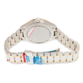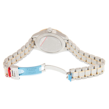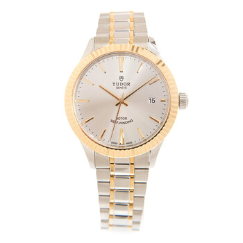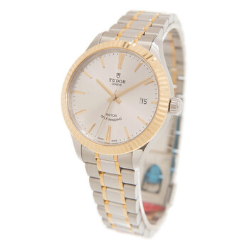 Silver-tone 18kt gold case with a two-tone 18kt yellow gold & stainless steel bracelet. Fixed gold-tone bezel. Silver-tone dial with gold-tone hands and index hour markers. Minute markers around the outer rim. Dial Type: Analog. Date display at the 3 o'clock position. Automatic movement. Scratch resistant sapphire crystal. Solid case back. Round case shape. Case size: 38 mm. Fold over with safety release clasp. Functions: date, hour, minute, second. Additional Info: original box, international warranty card, manual (complete accessories). Luxury watch style. Watch label: Swiss Made. Tudor Style Automatic Silver Dial Watch 12513-65063-SV.