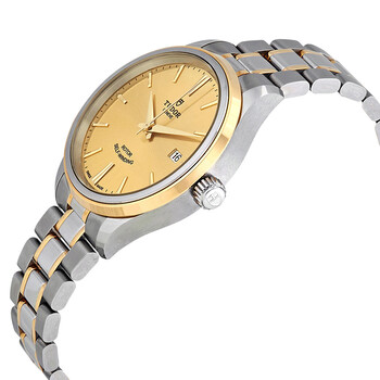 Stainless steel and 18kt yellow gold case with a stainless steel and 18kt yellow gold bracelet. Fixed stainless steel and 18kt yellow gold bezel. Champagne dial with silver-tone hands and index hour markers. Dial Type: Analog. Date display at the 3 o'clock position. Tudor Calibre 2824 automatic movement with a 38-hour power reserve. Scratch resistant mineral crystal. Screw down crown. Solid case back. Case size: 38 mm. Round case shape. Water resistant at 100 meters / 330 feet. Functions: date, hour, minute, second. Dress watch style. Watch label: Swiss Made. Tudor Style Champagne Dial Automatic Steel and 18kt Yellow Gold Men's Watch 12503-0001.