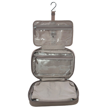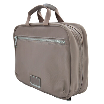 Tumi Ladies Cosmetic Case. SKU: 0196627LTM. Color: Pink. Size: 20.5 x 28.5 x 7 cm. Tumi Voyageur Madeline Nylon Cosmetic Case. This cosmetic case features a double-zip entry to the main compartment, a front zip pocket, and a top carry handle with a leather wrap trim, along with a monogrammable patch. The interior includes three transparent zip pockets with a wipeable lining, a detachable zip pouch, and a metal hanger for added convenience. Material: Nylon.