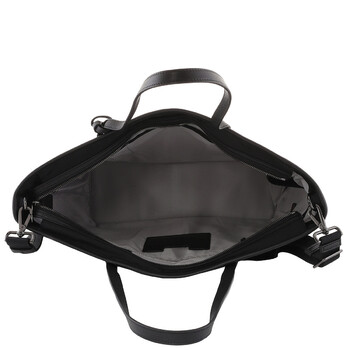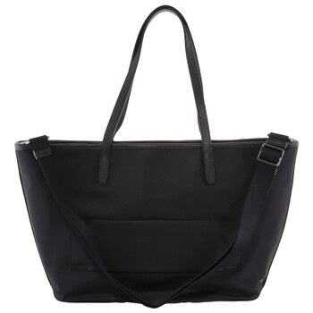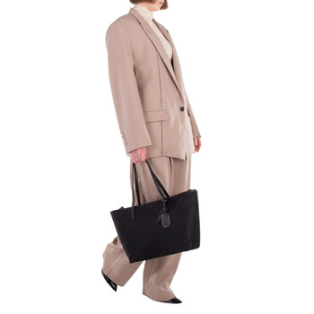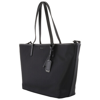 Tumi Ladies Tote. Voyageur series. SKU: 0196660DGME. Color: Black. Size: H: 10.4" x W: 18.3" x D: 4.7". Tumi Voyageur Small Everyday Tote Bag. The tote bag from the Voyageur collection features a zip entry to the main compartment, leather shoulder straps, a quick-access phone pocket, an Add-A-Bag strap, leather feet, a monogrammable detachable leather charm, and a removable adjustable crossbody strap. Inside, it offers a leather card pocket, zip pocket, media pocket, pen pocket, key leash, and a water-resistant water bottle pocket. 100% Nylon.
