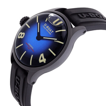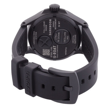 Black stainless steel case with a black rubber strap. Fixed black stainless steel bezel. Blue dial with black hands and Arabic numeral & index hour markers. Dial Type: Analog. Luminescent hands and markers. Ronda Caliber 712.3 quartz movement. Scratch resistant sapphire crystal. Screw down crown. Solid case back. Round case shape, case size: 40 mm. Buckle clasp. Water resistant at 50 meters / 165 feet. Functions: hour, minute. Capsoil Darkmoon Series. Casual watch style. U-Boat Capsoil Darkmoon Quartz Blue Dial Men's Watch 9020.