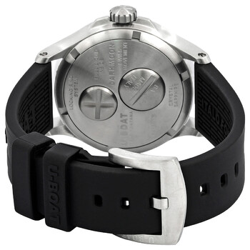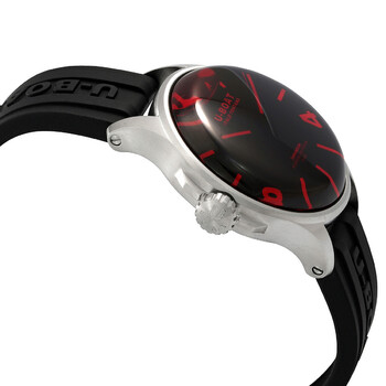 Silver-tone stainless steel case with a black rubber strap. Fixed silver-tone stainless steel bezel. Red dial with black hands and Arabic numeral & index hour markers. Dial Type: Analog. Ronda Caliber 712 quartz movement. Scratch resistant sapphire crystal. Solid case back. Round case shape, case size: 40 mm. Buckle clasp. Water resistant at 50 meters / 165 feet. Functions: hour, minute. Capsoil Darkmoon Series. Casual watch style. Watch label: Swiss Movt. U-Boat Capsoil Darkmoon Quartz Red Dial Men's Watch 9305.