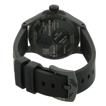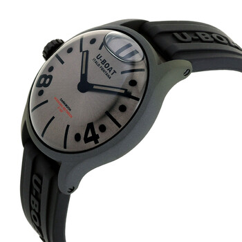 Black 316L stainless steel case with a black silicone strap. Fixed black bezel. Grey dial with black hands and index-Arabic numeral hour markers. Minute scale around the inner rim. Dial Type: Analog. Luminescent hands and markers. Ronda Caliber 712.3 quartz movement. Scratch resistant sapphire crystal. Screw down crown. Solid case back. Round case shape, case size: 40 mm. Buckle clasp. Water resistant at 50 meters / 165 feet. Functions: hour, minute, second. Capsoil Series. Sport watch style. U-Boat Capsoil Quartz Men's Watch 9551.