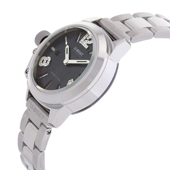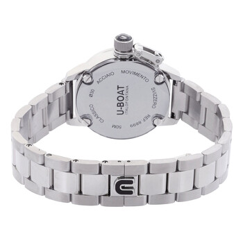 Silver-tone stainless steel case and bracelet. Fixed silver-tone stainless steel bezel. Black dial with silver-tone hands and Arabic numeral & index hour markers. Dial Type: Analog. Date display at the 9 o'clock position. Ronda Caliber 774 quartz movement. Scratch resistant sapphire crystal. Solid case back. Round case shape, case size: 30 mm. Fold over clasp with a safety release. Water resistant at 50 meters / 165 feet. Functions: date, hour, minute. Classico Series. Casual watch style. Watch label: Swiss Movt. U-Boat Classico Quartz Black Dial Ladies Watch 8899.