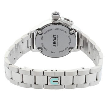 Silver-tone stainless steel case and bracelet. Fixed silver-tone stainless steel bezel. Green dial with silver-tone hands and Arabic numeral & index hour markers. Dial Type: Analog. Date display at the 9 o'clock position. Ronda Caliber 774 quartz movement. Scratch resistant sapphire crystal. Solid case back. Round case shape, case size: 30 mm. Fold over clasp with a safety release. Water resistant at 50 meters / 165 feet. Functions: date, hour, minute. Classico Series. Casual watch style. Watch label: Swiss Movt. U-Boat Classico Quartz Green Dial Ladies Watch 8900.