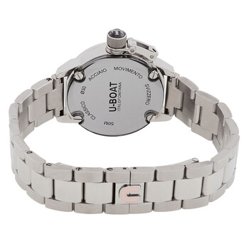 Stainless steel case with a stainless steel bracelet. Fixed stainless steel bezel. Pink dial with silver-tone hands and index hour markers. Arabic numerals appear at the 4, 8 and 12 o'clock positions. Dial Type: Analog. Date display at the 9 o'clock position. Ronda caliber 774 quartz movement. Scratch resistant sapphire crystal. Transparent case back. Round case shape. Case size: 30 mm. Fold over clasp with a safety release. Water resistant at 50 meters / 165 feet. Functions: date, hour, minute. Classico Series. Casual watch style. Watch label: Swiss Made. U-Boat Classico Quartz Pink Dial Ladies Watch 8898.