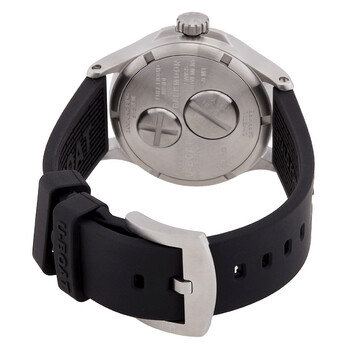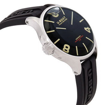 Silver-tone stainless steel case with a black rubber strap. Fixed silver-tone stainless steel bezel. Black dial with black hands and index-Arabic numeral hour markers. Dial Type: Analog. Luminescent hands and markers. Quartz movement. Scratch resistant sapphire crystal. Screw down crown. Solid case back. Round case shape, case size: 40 mm. Buckle clasp. Water resistant at 50 meters / 165 feet. Functions: hour, minute. Darkmoon Series. Casual watch style. U-Boat Darkmoon Quartz Black Dial Men's Watch 9018-A.