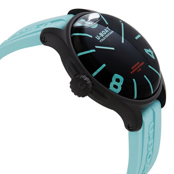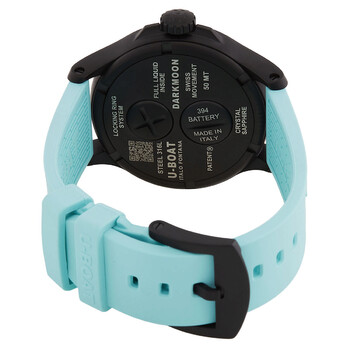 Black stainless steel case with a blue rubber strap. Fixed black stainless steel bezel. Black dial with black hands and Arabic numeral & index hour markers. Dial Type: Analog. Luminescent hands and markers. Date display at the 3 o'clock position. Quartz movement. Scratch resistant sapphire crystal. Round case shape, case size: 44 mm. Buckle clasp. Water resistant at 50 meters / 165 feet. Functions: date, hour, minute. Darkmoon Series. Casual watch style. U-Boat Darkmoon Quartz Black Dial Men's Watch 9526.