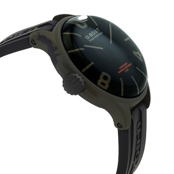 Black stainless steel case with a black rubber strap. Fixed black stainless steel bezel. Black dial with black hands and Arabic numeral & index hour markers. Dial Type: Analog. Luminescent hands and markers. Quartz movement. Scratch resistant sapphire crystal. Solid case back. Round case shape, case size: 44 mm. Buckle clasp. Water resistant at 50 meters / 165 feet. Functions: hour, minute. Darkmoon Series. Casual watch style. U-Boat Darkmoon Quartz Black Dial Men's Watch 9553.