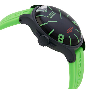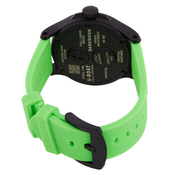 Black stainless steel case with a green rubber strap. Fixed black stainless steel bezel. Black dial with black hands and Arabic numeral & index hour markers. Dial Type: Analog. Luminescent hands and markers. Date display at the 3 o'clock position. Quartz movement. Scratch resistant sapphire crystal. Round case shape, case size: 44 mm. Buckle clasp. Water resistant at 50 meters / 165 feet. Functions: date, hour, minute. Darkmoon Series. Casual watch style. U-Boat Darkmoon Quartz Black Dial Men's Watch 9534.