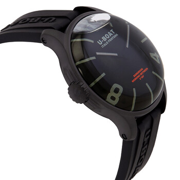 Black stainless steel case with a black rubber strap. Fixed black stainless steel bezel. Black dial with black hands and Arabic numeral & index hour markers. Dial Type: Analog. Luminescent hands and markers. Quartz movement. Scratch resistant sapphire crystal. Solid case back. Round case shape, case size: 44 mm. Buckle clasp. Water resistant at 50 meters / 165 feet. Functions: hour, minute. Darkmoon Series. Casual watch style. U-Boat Darkmoon Quartz Black Dial Men's Watch 9544.
