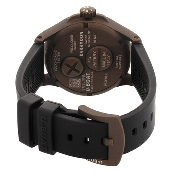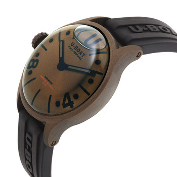 Bronze case with a black rubber strap. Fixed bronze bezel. Brown dial with black hands and Arabic numeral & index hour markers. Dial Type: Analog. Quartz movement. Scratch resistant sapphire crystal. Solid case back. Round case shape, case size: 40 mm. Buckle clasp. Water resistant at 50 meters / 165 feet. Functions: hour, minute. Darkmoon Series. Casual watch style. U-Boat Darkmoon Quartz Brown Dial Men's Watch 9547.