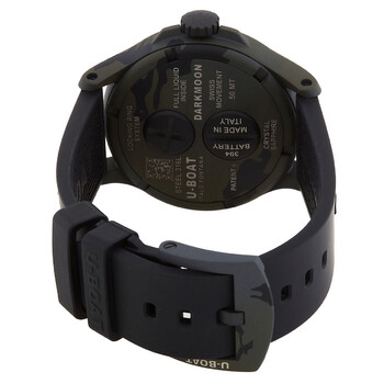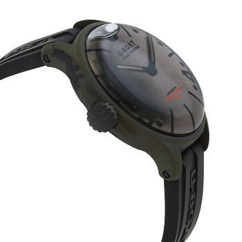 Black stainless steel case with a black rubber strap. Fixed black stainless steel bezel. Grey dial with black hands and Arabic numeral & index hour markers. Dial Type: Analog. Quartz movement. Scratch resistant sapphire crystal. Solid case back. Round case shape, case size: 44 mm. Buckle clasp. Water resistant at 50 meters / 165 feet. Functions: hour, minute. Darkmoon Series. Casual watch style. U-Boat Darkmoon Quartz Grey Dial Men's Watch 9550.