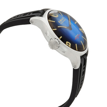 Black stainless steel case with a black rubber strap. Fixed black stainless steel bezel. Blue dial with black hands and Arabic numeral & index hour markers. Dial Type: Analog. Luminescent hands and markers. Ronda Caliber 712.3 quartz movement. Scratch resistant sapphire crystal. Screw down crown. Solid case back. Round case shape, case size: 40 mm. Buckle clasp. Water resistant at 50 meters / 165 feet. Functions: hour, minute. Capsoil Darkmoon Series. Casual watch style. U-Boat Capsoil Darkmoon Quartz Blue Dial Men's Watch 9021.